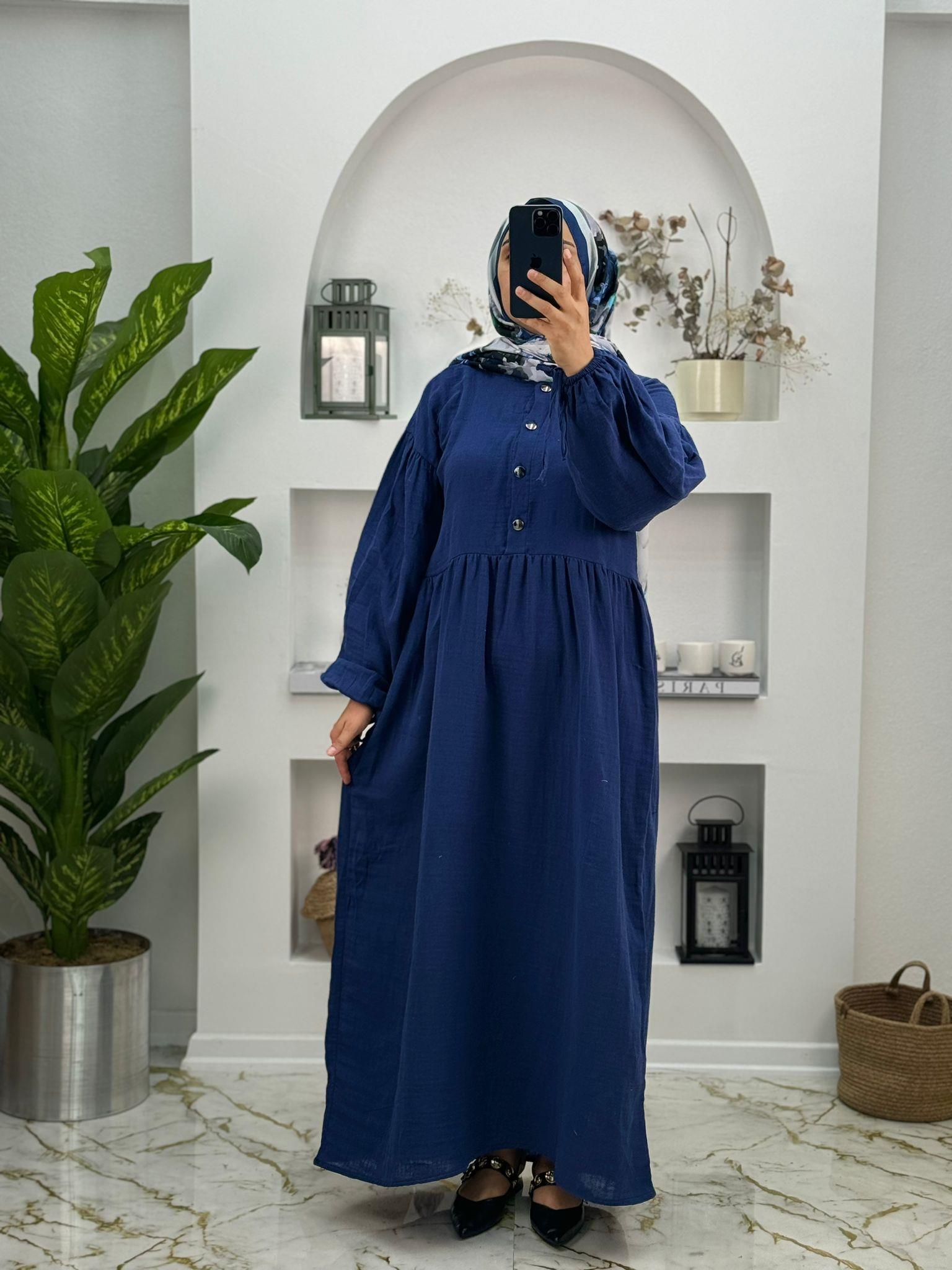 Müslim kumaş yarı düğmeli pileli elbise, doğal ve nefes alabilen müslin kumaştan üretilmiş, ön kısmı yarıya kadar düğmeli ve etek bölümünde pile detayları bulunan şık ve rahat bir elbise modelidir. Salaş yapısı ve zarif tasarımıyla günlük kullanımda ve özel günlerde tercih edilir.