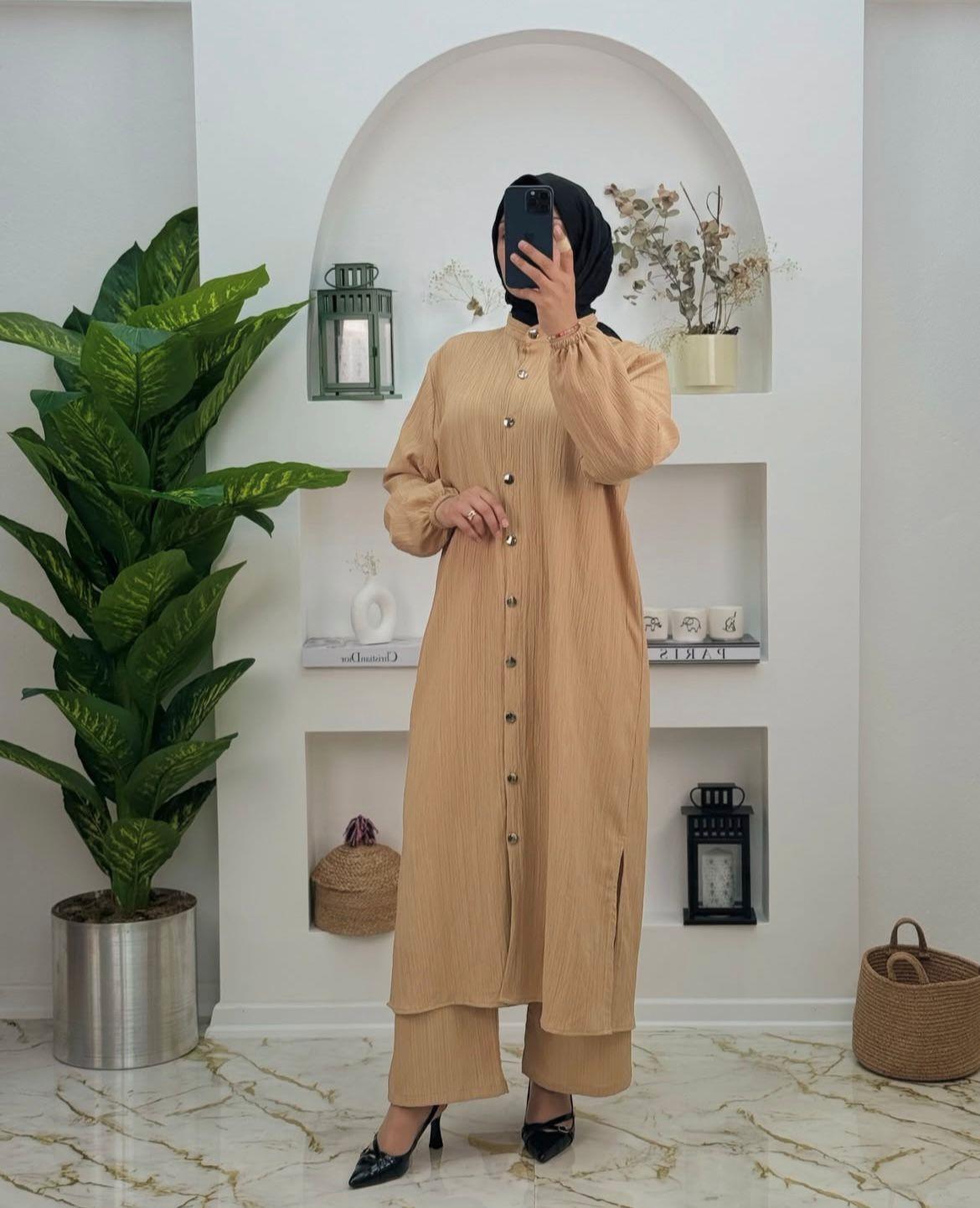 Krınkıl kumaş boydan düğmeli ikili takım, hafif buruşuk ve dökümlü yapısıyla bilinen krınkıl kumaştan üretilmiş, genellikle gömlek ve pantolondan oluşan rahat bir giyim setidir. Boydan düğmeli üst parçası sayesinde hem şık hem de kullanışlıdır; ister kapalı ister açık şekilde giyilebilir. Salaş ve nefes alabilen yapısıyla özellikle ilkbahar-yaz aylarında tercih edilir. Gündelik şıklık arayanlar için ideal bir kombin sunar.