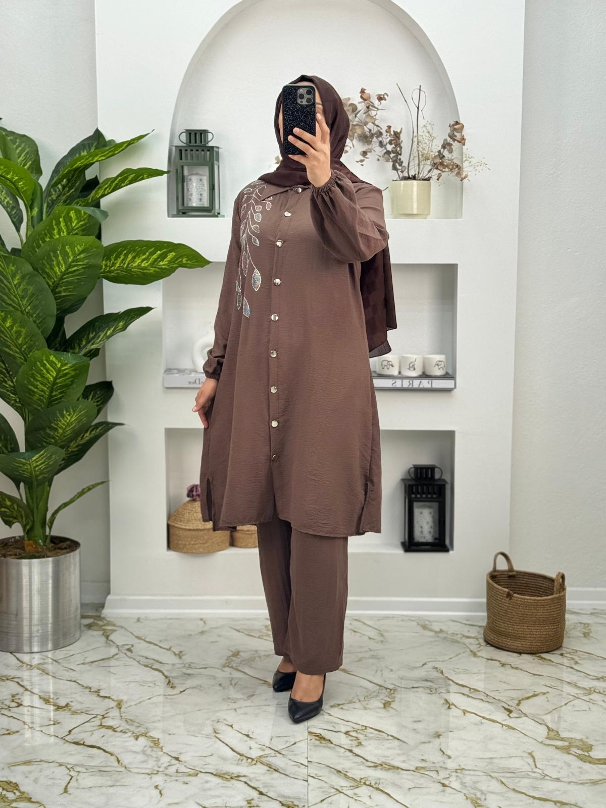 Airobin kumaş taş detaylı ikili takım, yumuşak dokusu ve dökümlü yapısıyla konfor sunan airobin kumaştan üretilmiştir. Zarif taş detayları sayesinde şık ve göz alıcı bir görünüm sağlar. Hem günlük kullanım hem de özel davetlerde rahatlıkla tercih edilebilecek bu ikili takım, modern ve zarif bir stil sunar. 38-40 beden göğüs ölçüsü 112 cm 42-44 beden göğüs ölçüsü 114 cm 46-48 beden göğüs ölçüsü 116 cm 50-52 beden göğüs ölçüsü 118 cm Manken Boy 170 cm Manken Kilo 65 Kg