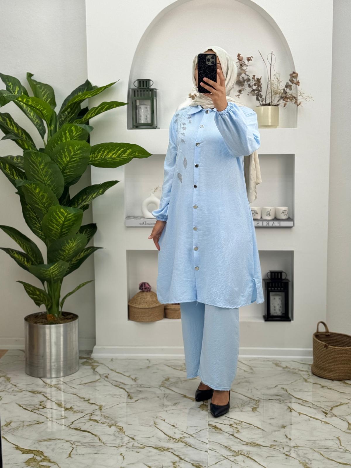 Airobin kumaş taş detaylı ikili takım, yumuşak dokusu ve dökümlü yapısıyla konfor sunan airobin kumaştan üretilmiştir. Zarif taş detayları sayesinde şık ve göz alıcı bir görünüm sağlar. Hem günlük kullanım hem de özel davetlerde rahatlıkla tercih edilebilecek bu ikili takım, modern ve zarif bir stil sunar.