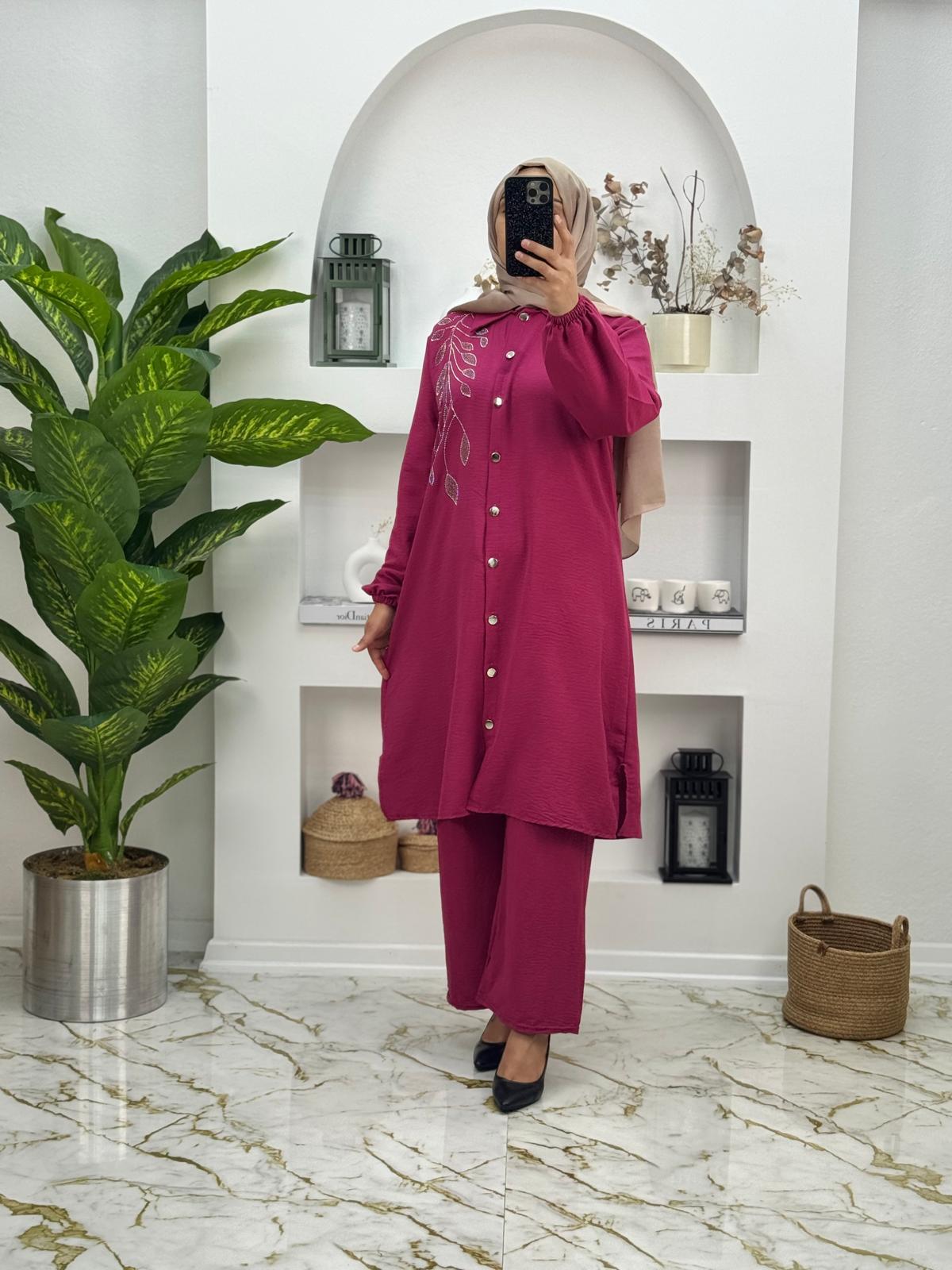 Airobin kumaş taş detaylı ikili takım, yumuşak dokusu ve dökümlü yapısıyla konfor sunan airobin kumaştan üretilmiştir. Zarif taş detayları sayesinde şık ve göz alıcı bir görünüm sağlar. Hem günlük kullanım hem de özel davetlerde rahatlıkla tercih edilebilecek bu ikili takım, modern ve zarif bir stil sunar.
