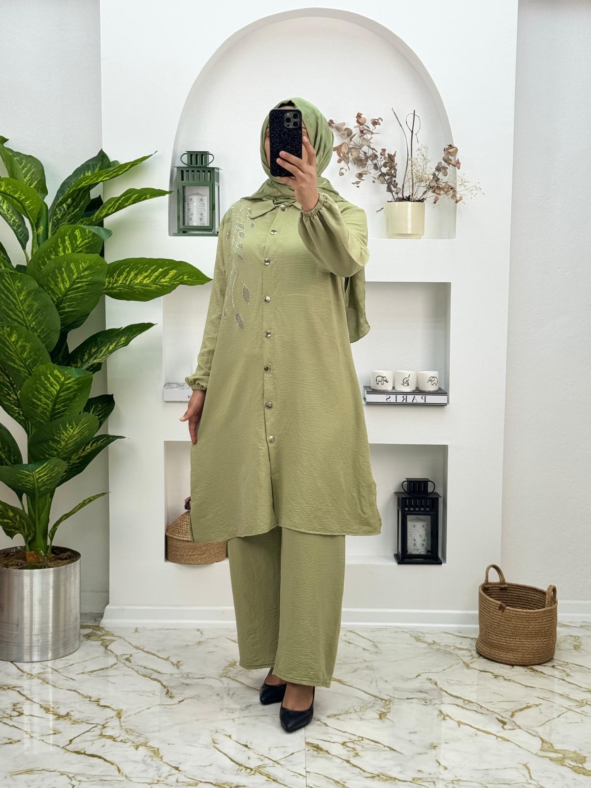 Airobin kumaş taş detaylı ikili takım, yumuşak dokusu ve dökümlü yapısıyla konfor sunan airobin kumaştan üretilmiştir. Zarif taş detayları sayesinde şık ve göz alıcı bir görünüm sağlar. Hem günlük kullanım hem de özel davetlerde rahatlıkla tercih edilebilecek bu ikili takım, modern ve zarif bir stil sunar.