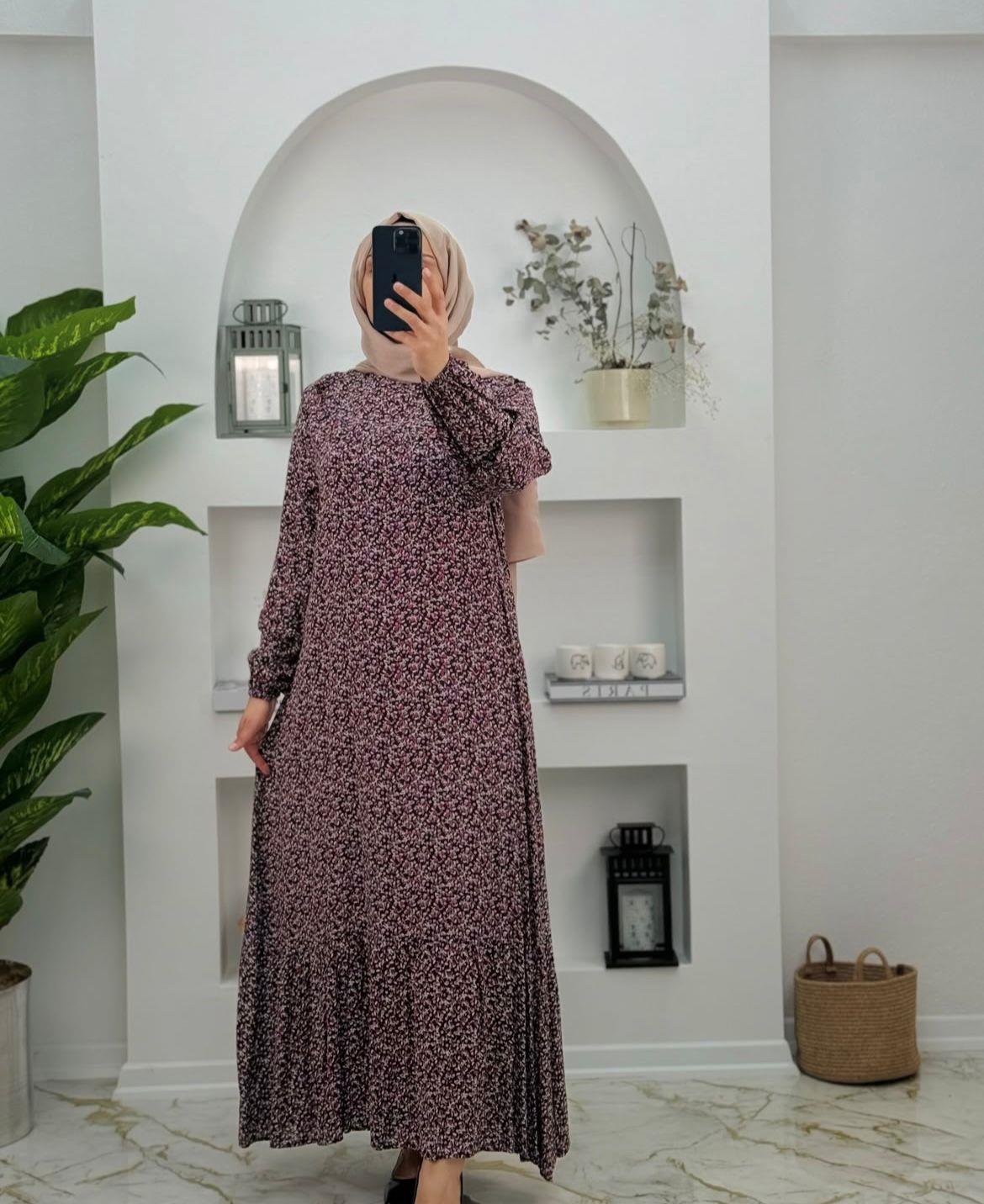 2020 Yeni Sezon Viskon Küçük Çiçek Desenli Halil Elbise Renk Mor (D009-2020)