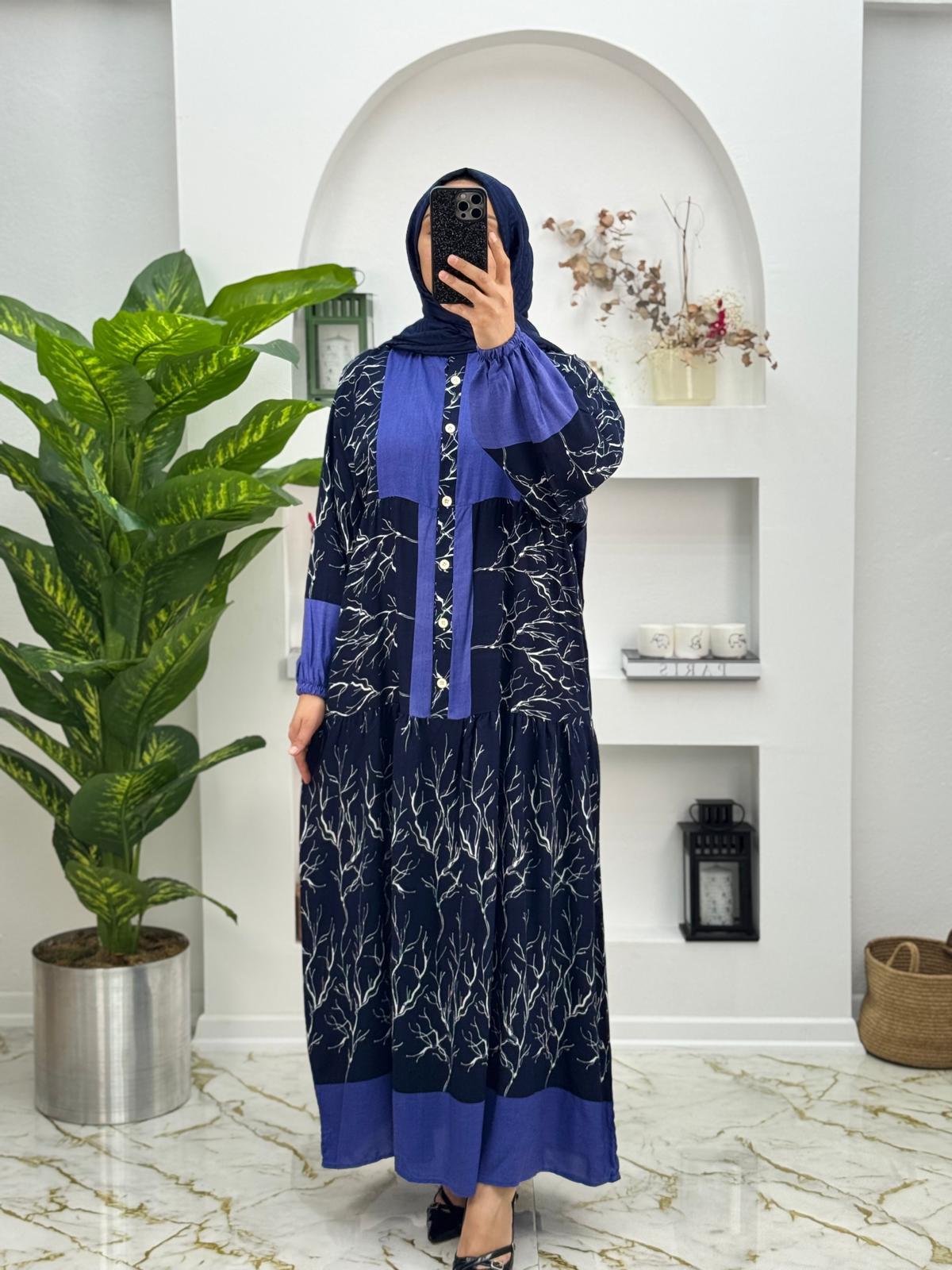 2089 Yeni Sezon Viskon Kumaş Yarım Düğmeli Alaçatı elbise Renk Mavi