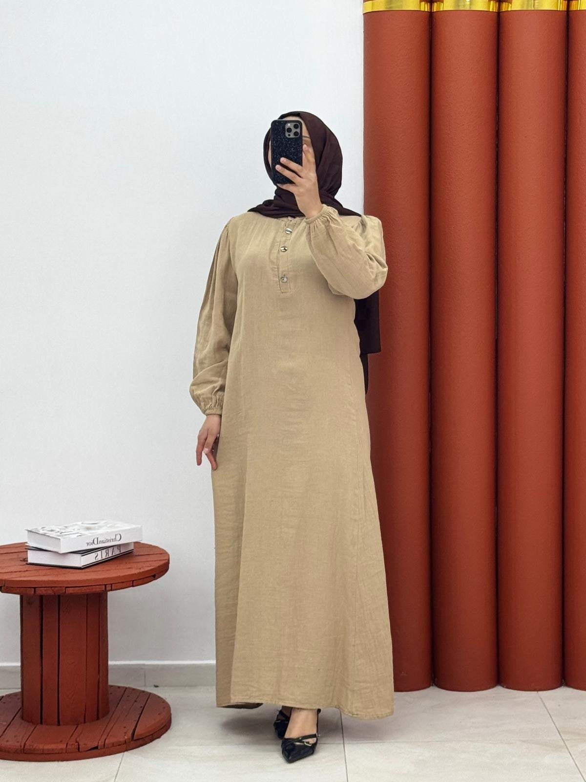 “Müslin kumaştan üretilen yarım düğmeli elbise; nefes alabilen hafif yapısıyla gün boyu konfor sunar. Doğal dokusu ve sade şıklığıyla hem günlük kullanım hem yaz kombinleri için ideal bir tercihtir.”