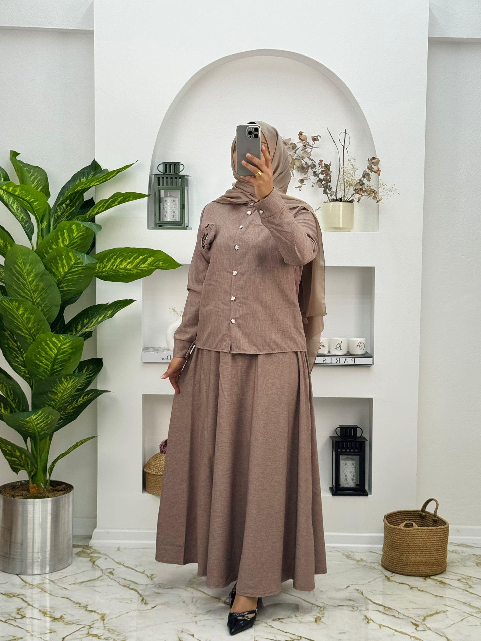 2545 Sofia Keten Kumaş Gül Detaylı Etekli Takım Renk Açık Kahverengi