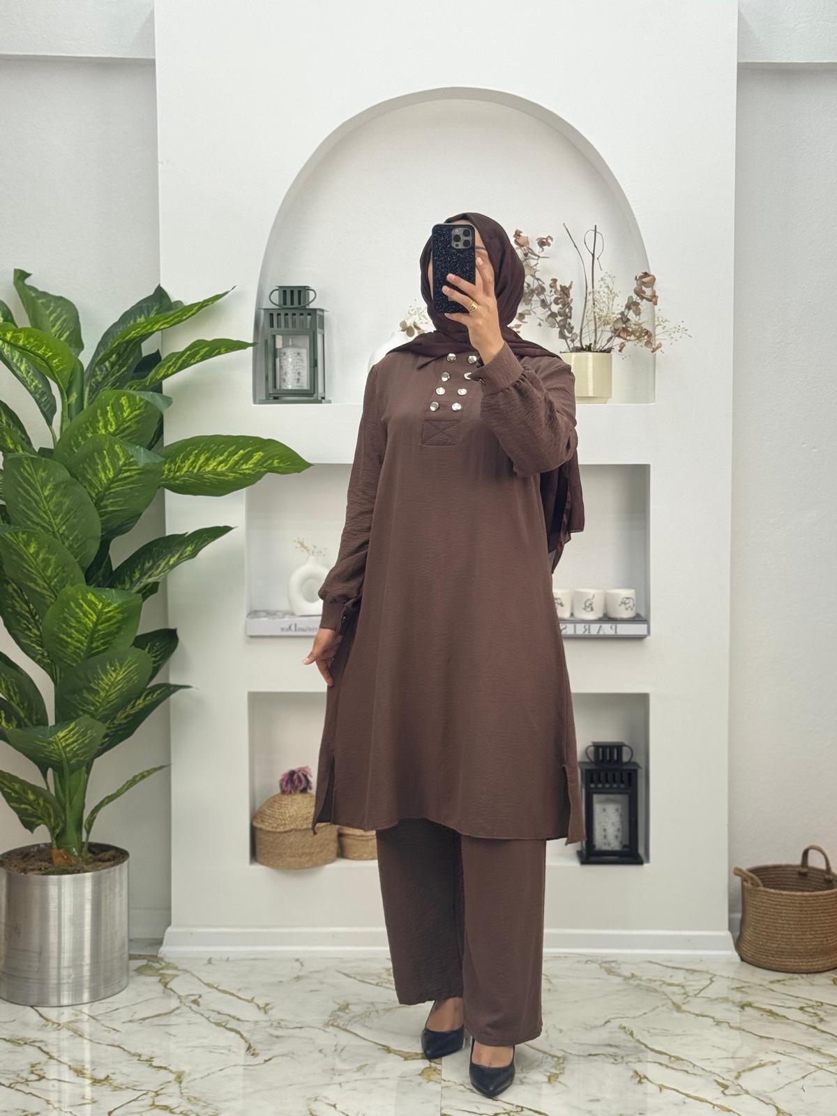 Airobin kumaş önü yarım düğmeli ikili takım, hafif, dökümlü ve kırışmaya dirençli yapısıyla bilinen airobin kumaştan üretilmiştir. Takımın üst parçasında yer alan yarım düğme detayı, sade tasarıma şıklık katarken pratik kullanım sunar. Rahat kesimiyle günlük kullanımda konfor sağlayan bu ikili takım, modern ve zarif bir görünüm arayanlar için ideal bir tercihtir.