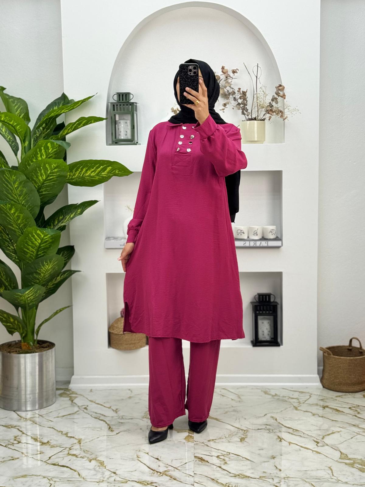 Airobin kumaş önü yarım düğmeli ikili takım, hafif, dökümlü ve kırışmaya dirençli yapısıyla bilinen airobin kumaştan üretilmiştir. Takımın üst parçasında yer alan yarım düğme detayı, sade tasarıma şıklık katarken pratik kullanım sunar. Rahat kesimiyle günlük kullanımda konfor sağlayan bu ikili takım, modern ve zarif bir görünüm arayanlar için ideal bir tercihtir.