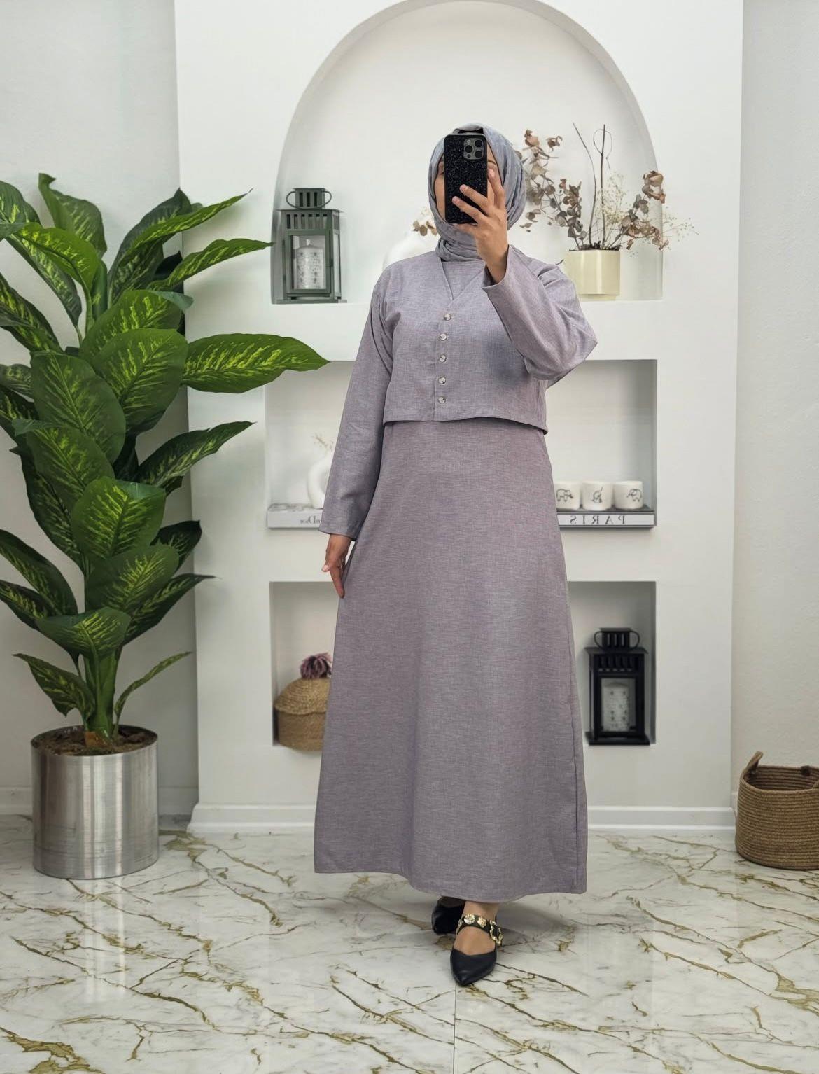 2555 Yeni Sezon Flamlı Keten Pamuk Kumaş Yelekli Elbise Renk Gri