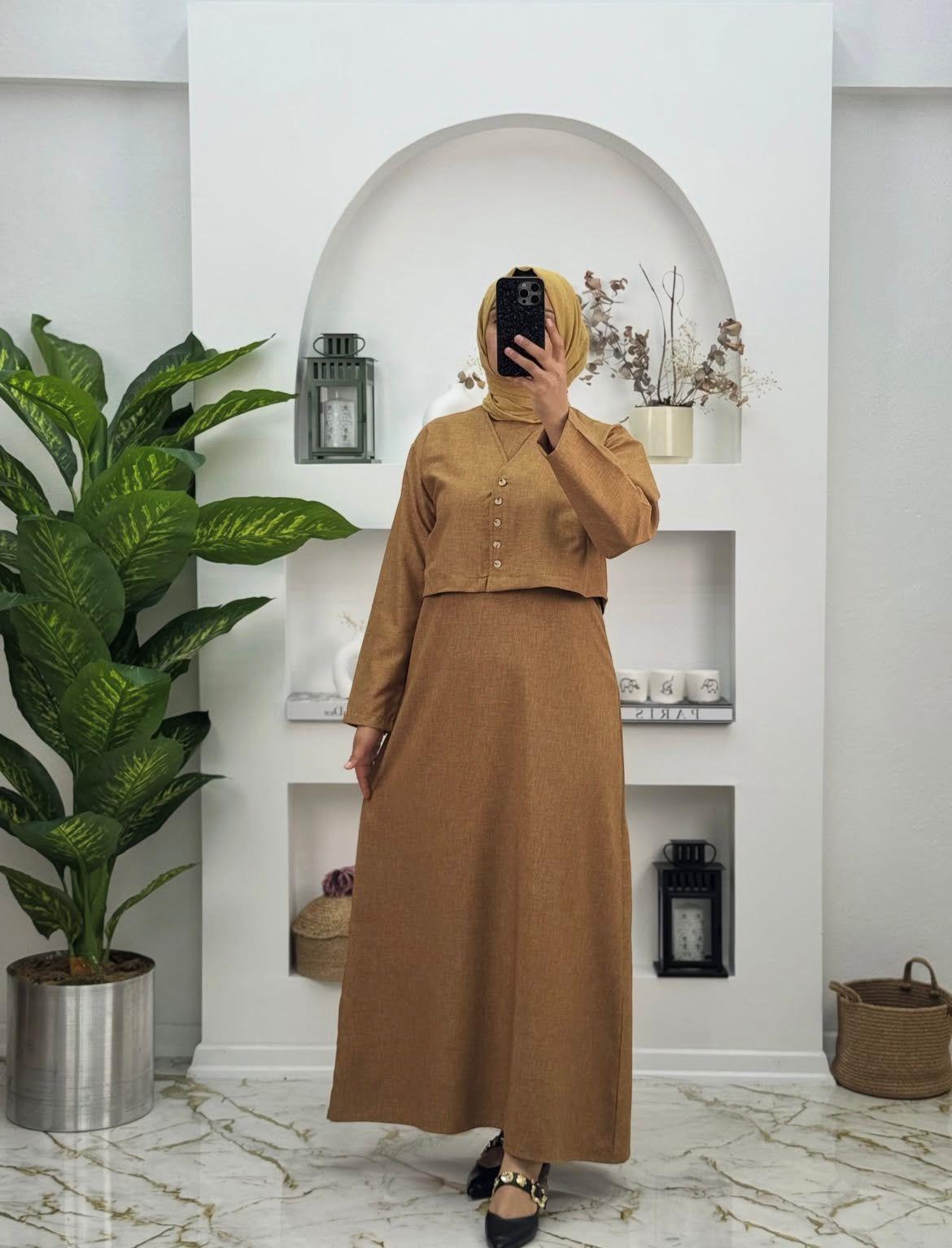 Flamlı keten pamuklu kumaş yelekli elbise, doğal dokulu, nefes alabilen ve hafif yapısıyla öne çıkan flamlı keten pamuklu kumaştan üretilmiştir. Elbiseye eşlik eden yelek detayı, tasarıma modern ve şık bir hava katarken çok yönlü kullanım imkânı sunar. Günlük kullanımda hem rahatlık hem de stil sahibi bir görünüm arayanlar için ideal bir parçadır.