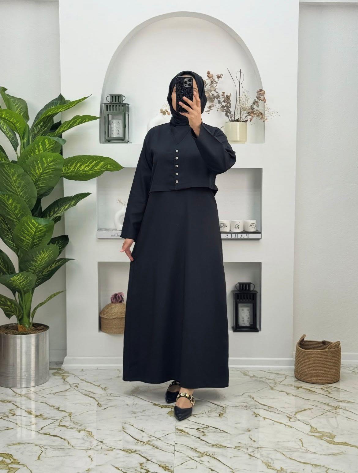 2555 Yeni Sezon Flamlı Keten Pamuk Kumaş Yelekli Elbise Renk siyah