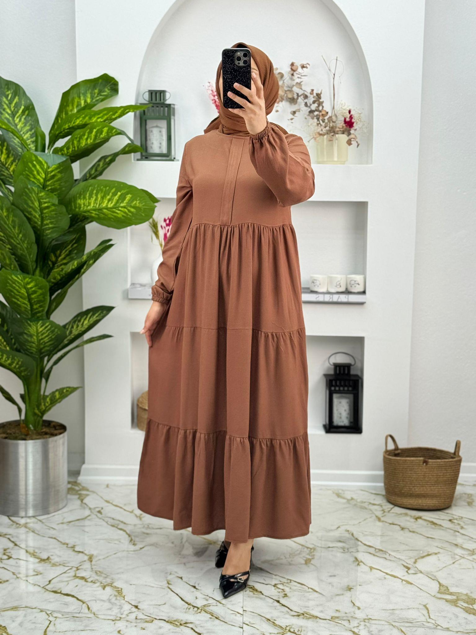 Pamuklu kaşmir kumaştan üretilen bu elbise, yumuşak dokusu ve hafif yapısıyla konforlu bir kullanım sunar. Önden patlı ve kat katlı tasarımıyla zarif bir görünüm sağlarken, lastikli kol uçları modern ve rahat bir detay sunar. Enseden fermuar kapamalı yapısı ise pratik giyim kolaylığı sağlar. Günlük şıklık ve mevsim geçişleri için ideal bir tercihtir.