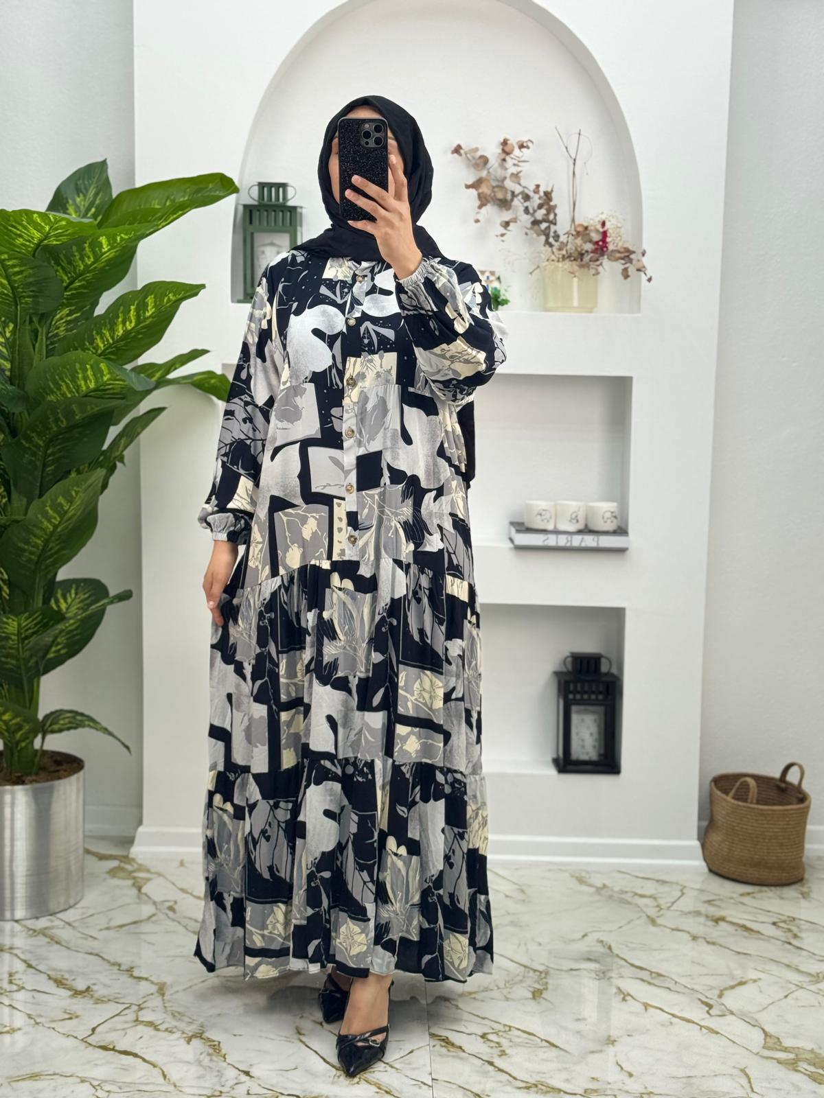 5070 Yeni Sezon Viskon Kumaş Yarım Düğmeli Elbise Renk Gri