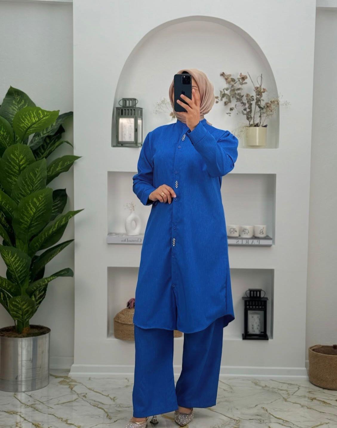 Keten kumaş boydan düğmeli ikili takım, doğal ve hafif yapısıyla yaz aylarında sıkça tercih edilen keten kumaştan üretilmiş, üst parçası önden boydan düğmeli, alt parçası ise genellikle pantolon veya etekten oluşan iki parçalı şık bir takımdır. Hem rahat hem de sade ve zarif bir görünüm sunar. Günlük kullanımda veya şık kombinlerde tercih edilebilir, nefes alan yapısı sayesinde konforludur.