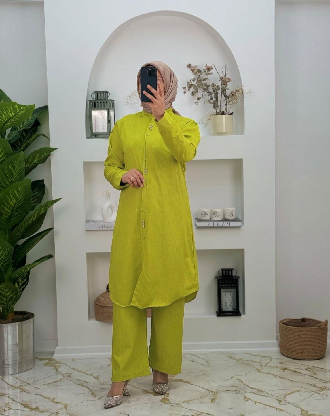Keten kumaş boydan düğmeli ikili takım, doğal ve hafif yapısıyla yaz aylarında sıkça tercih edilen keten kumaştan üretilmiş, üst parçası önden boydan düğmeli, alt parçası ise genellikle pantolon veya etekten oluşan iki parçalı şık bir takımdır. Hem rahat hem de sade ve zarif bir görünüm sunar. Günlük kullanımda veya şık kombinlerde tercih edilebilir, nefes alan yapısı sayesinde konforludur. 38-40 beden göğüs ölçüsü 112 cm 42-44 beden göğüs ölçüsü 114 cm 46-48 beden göğüs ölçüsü 116 cm 50-52 beden göğüs ölçüsü 118 cm Manken Kilo 65 kg Manken Boy 170 cm