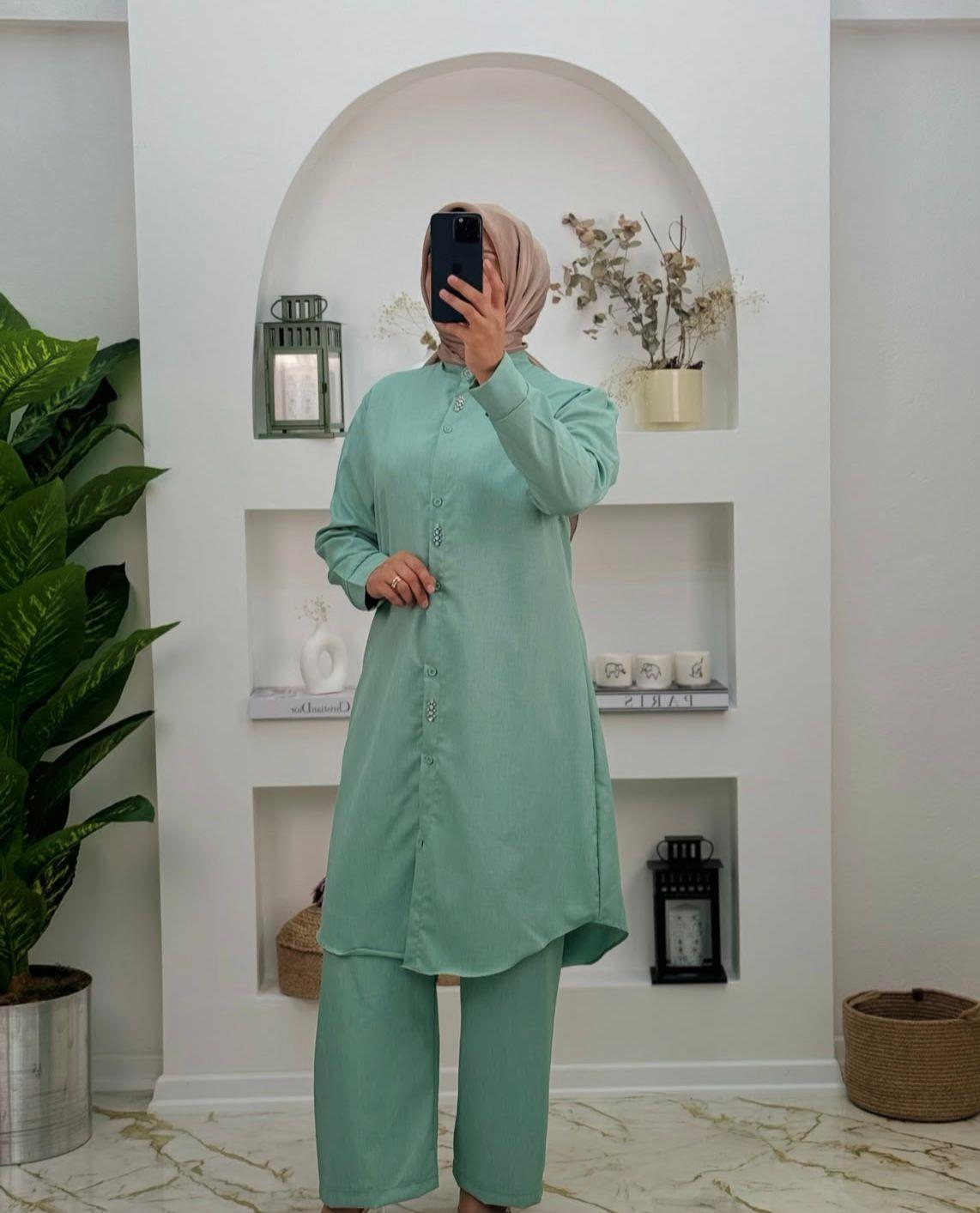 5080 Yeni Sezon Keten Boydan Düğmeli Asya İkili takım Renk Yeşil (D008-5080)