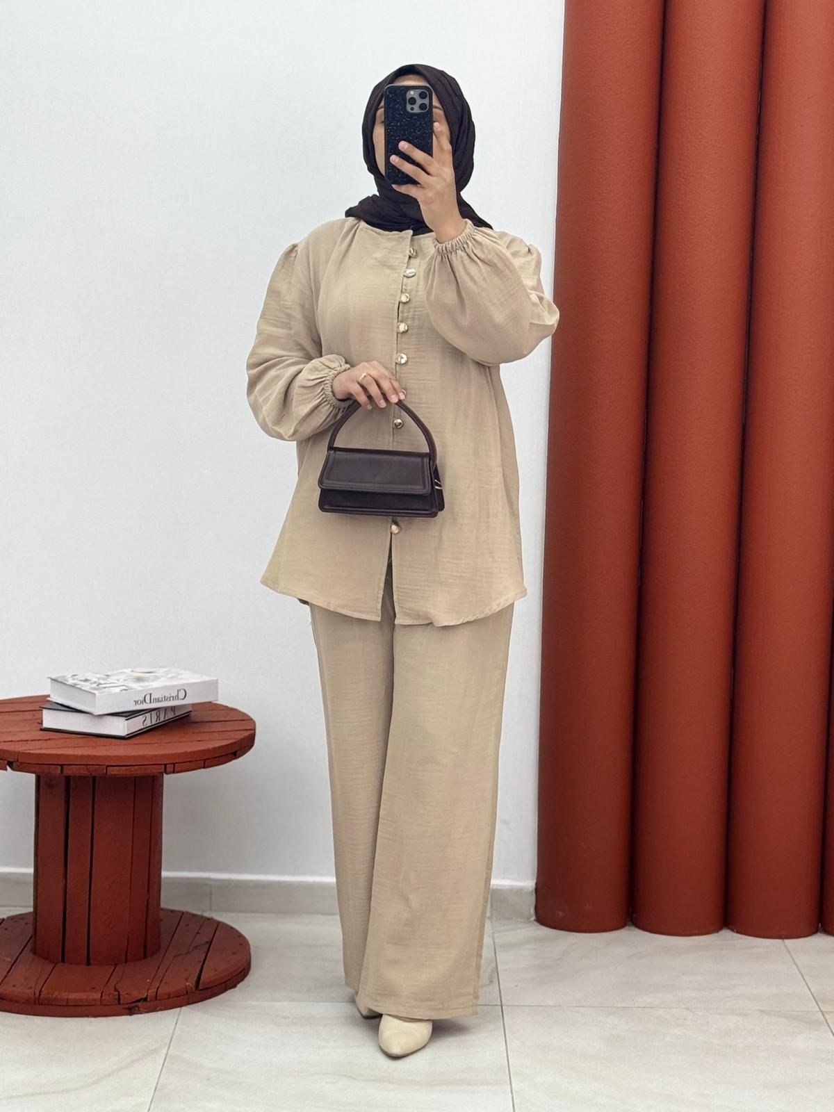 Hafif ve nefes alabilen müslin kumaştan üretilen bu şık ikili takım, düğme detayları ve seyyar kemeriyle hem rahat hem zarif bir kullanım sunar. Günlük şıklık için ideal olan bu parça, konforu ve modern tarzı bir arada sunar.