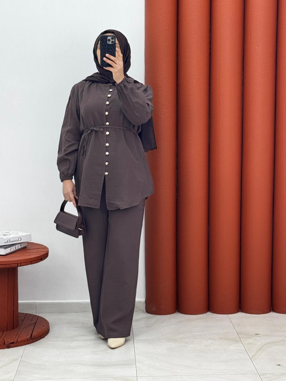 5869 Müslin kumaş dügmeli ikili takım kahverengi