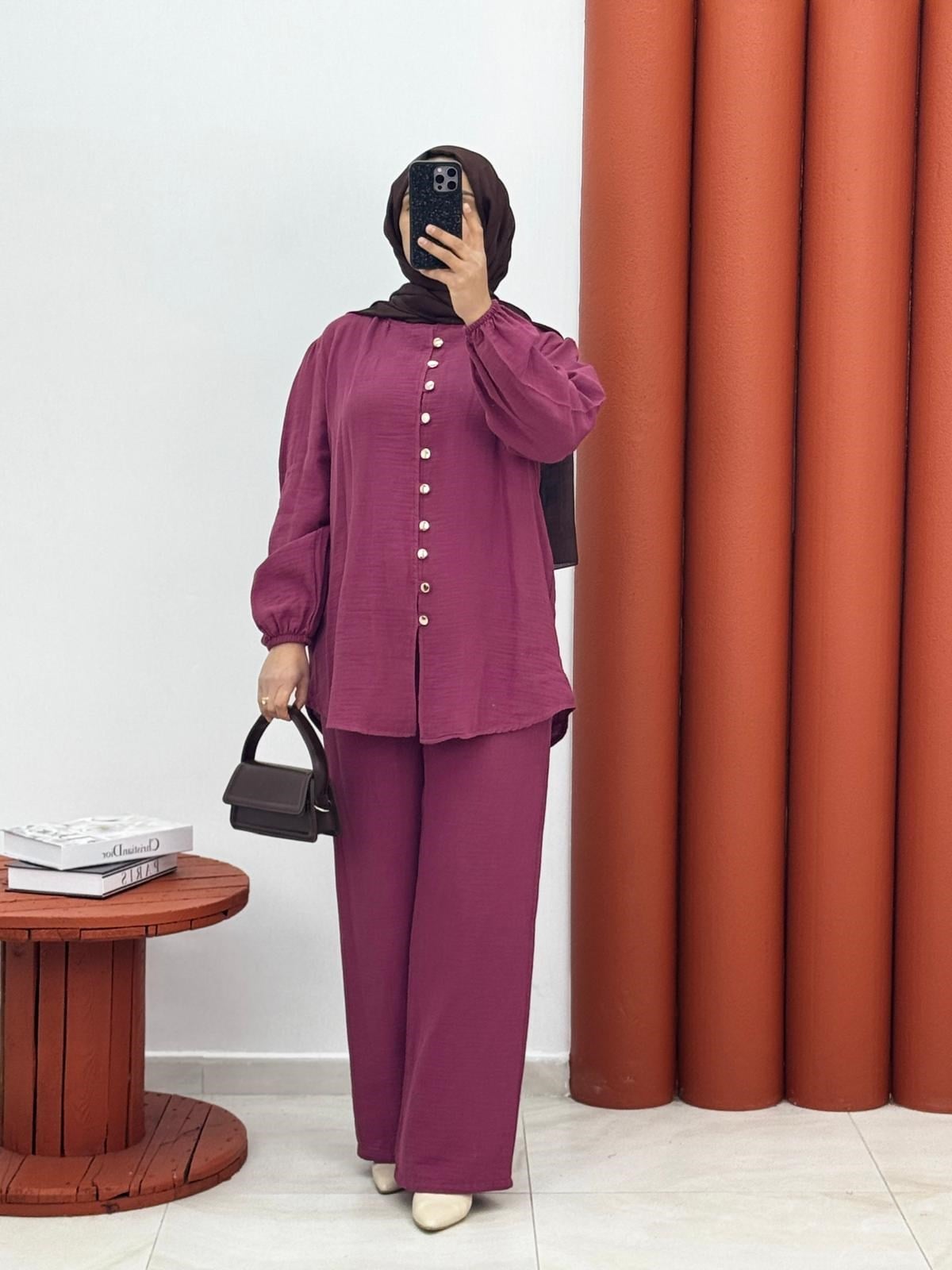 5869 Müslin kumaş dügmeli ikili takım mürdüm