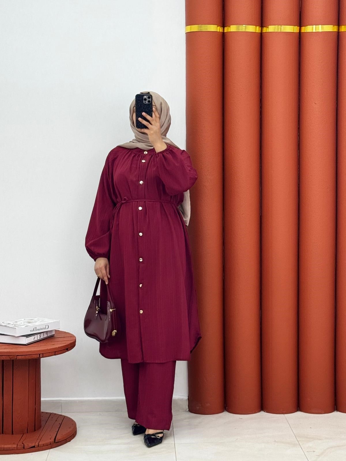 Kırinkıl kaş kumaştan üretilen bu şık ikili takım, modern ve zarif görünümüyle öne çıkar. Üst kısmındaki düğme detayları ve seyyar kemeri sayesinde hem rahat hem de vücuda uyum sağlayan bir kullanım sunar. Günlük şıklıkta ve özel kombinlerde tercih edilebilecek, pratik ve stil sahibi bir seçenektir.