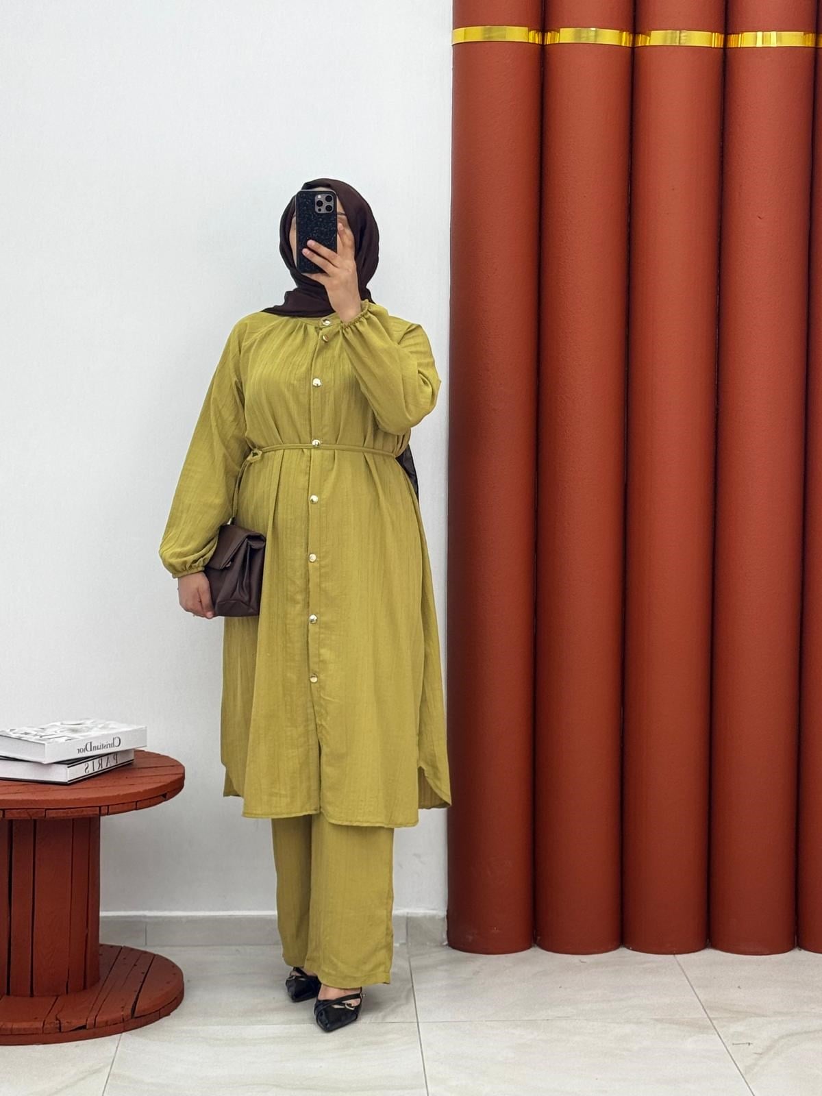 Kırinkıl kaş kumaştan üretilen bu şık ikili takım, modern ve zarif görünümüyle öne çıkar. Üst kısmındaki düğme detayları ve seyyar kemeri sayesinde hem rahat hem de vücuda uyum sağlayan bir kullanım sunar. Günlük şıklıkta ve özel kombinlerde tercih edilebilecek, pratik ve stil sahibi bir seçenektir.
