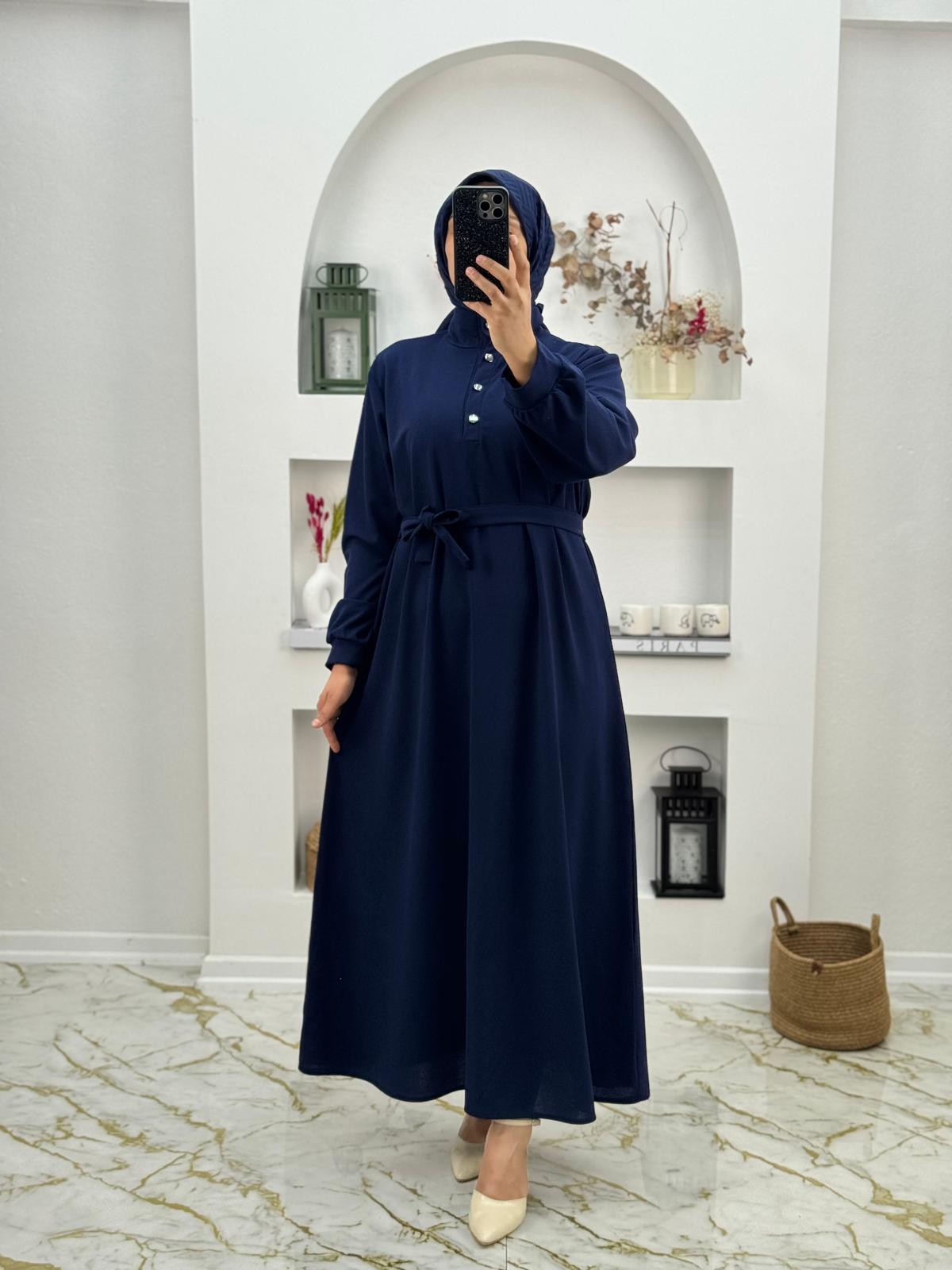 6689 Scuba Krep Kumaş Önden Düğmeli Seyyar Kemerli Elbise Renk Lacivert (E012-6689)