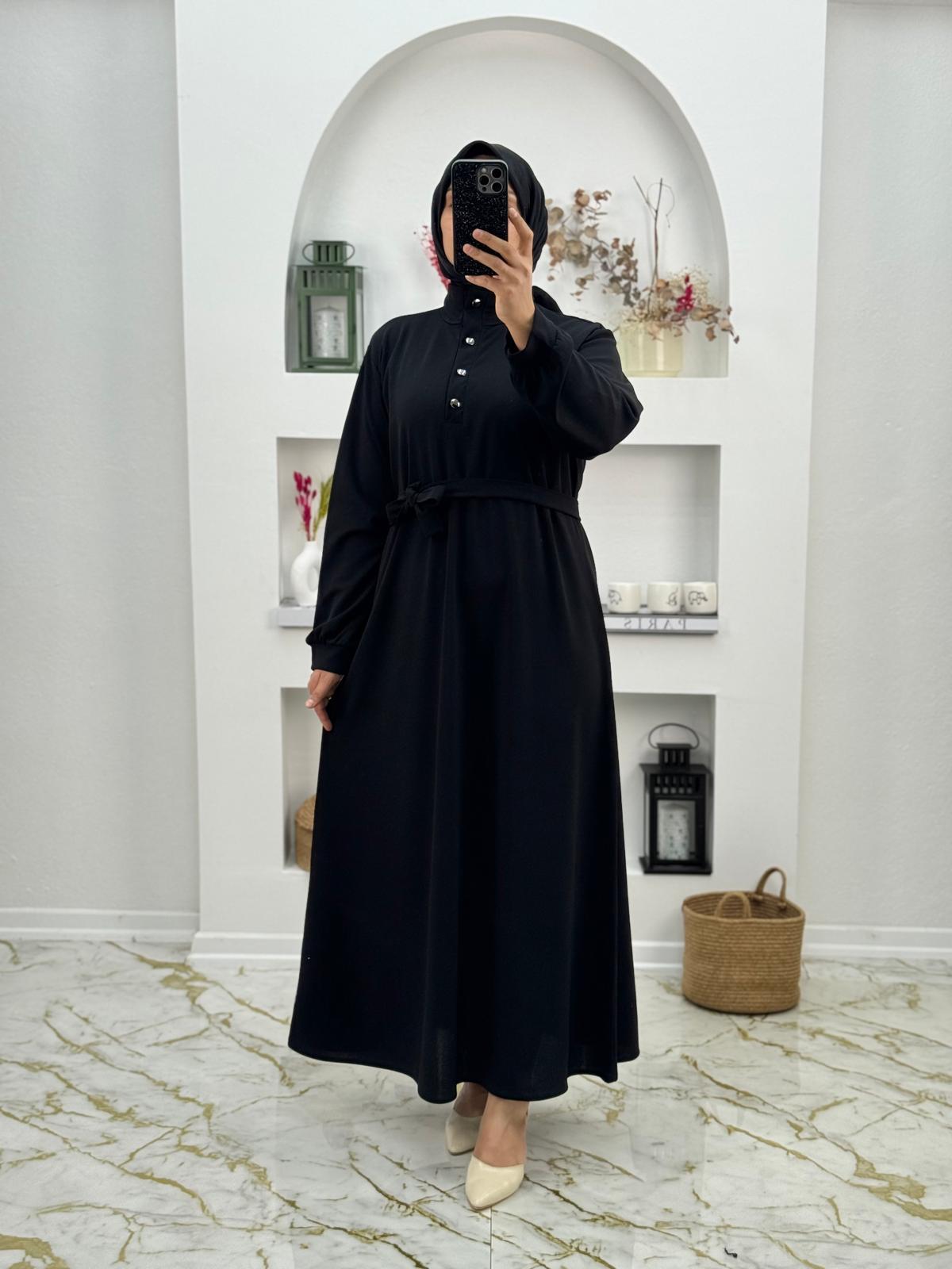 Scuba krep kumaş önden yarım düğmeli seyyar kemerli elbise, esnek ve tok yapılı scuba krep kumaştan üretilmiş, ön kısmı yarım düğmeli tasarıma sahip, bel kısmında çıkarılabilir (seyyar) kemerle tamamlanan şık ve konforlu bir elbisedir. Hem günlük kullanımda hem de özel davetlerde zarif bir görünüm sunar.