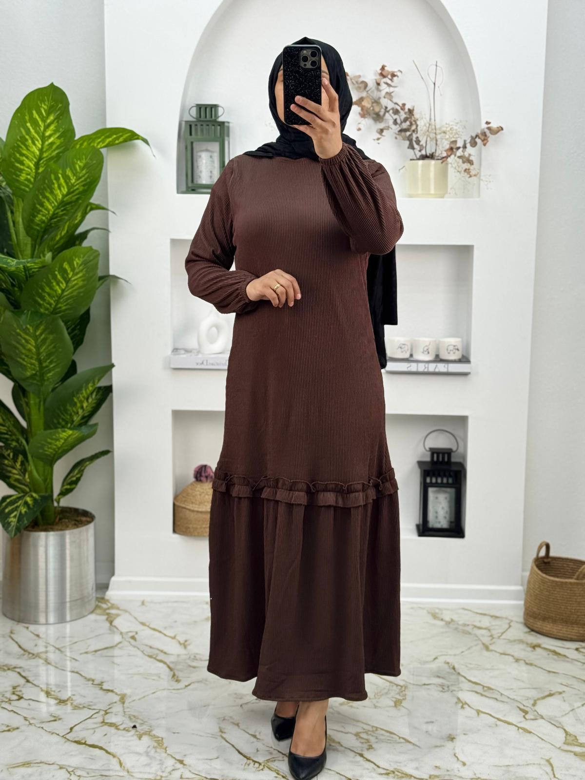 8487 Yeni Sezon Burgu Kumaş Etegi fırfırlı elbise Renk Kahverengi