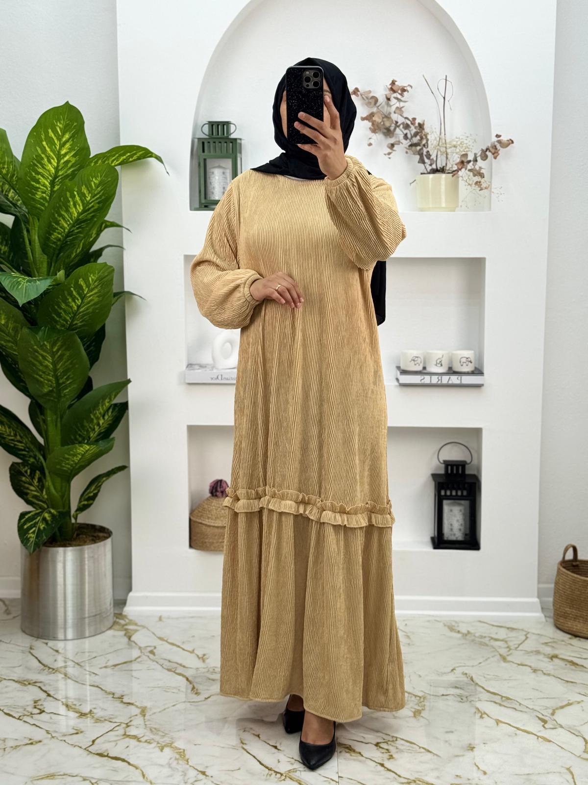 8487 Yeni Sezon Burgu Kumaş Etegi fırfırlı elbise Renk karamel (F012-8487)