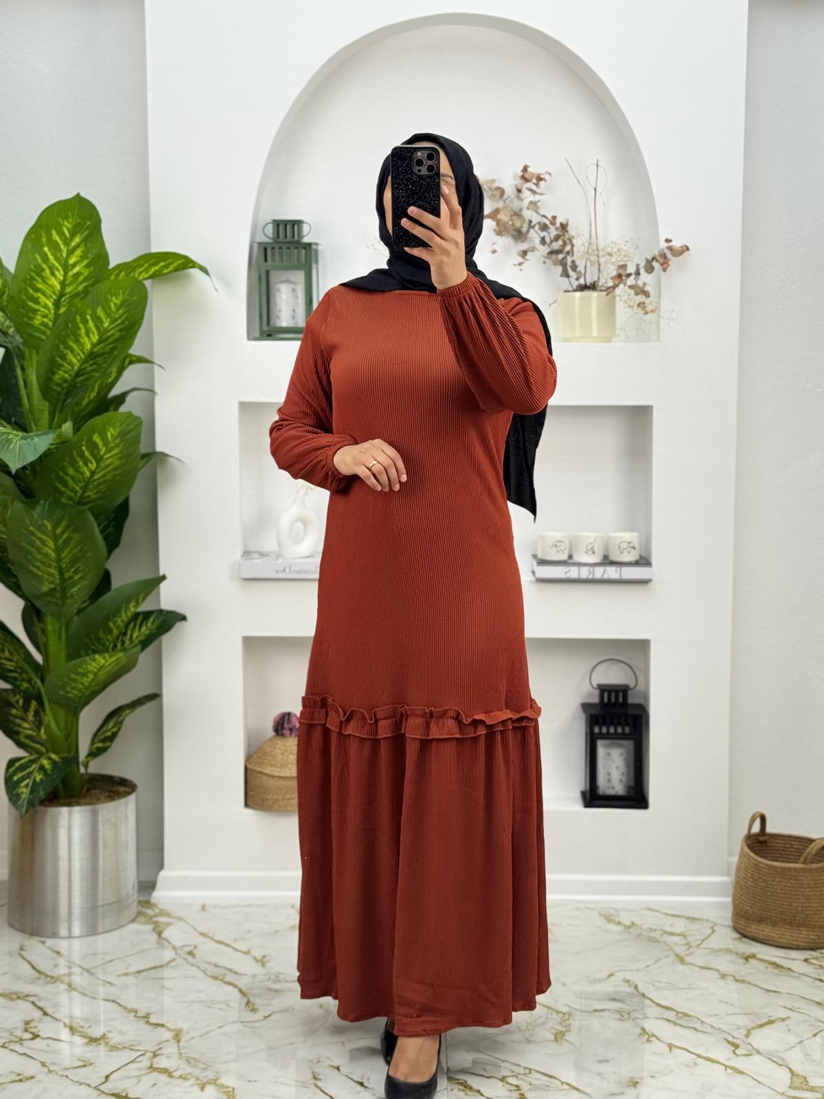 Burgu kumaş alt kısmı fırfırlı elbise, şık ve feminen bir tarza sahip elbise modelidir. Üst kısmı burgu (bükümlü) kumaştan yapılarak vücuda oturan bir form sunarken, alt kısmındaki fırfır detayları elbiseye hareket ve zarafet katar. Günlük kullanımda veya özel davetlerde rahatlıkla tercih edilebilir. Hem konforlu hem de dikkat çekici bir görünüm sağlar.
