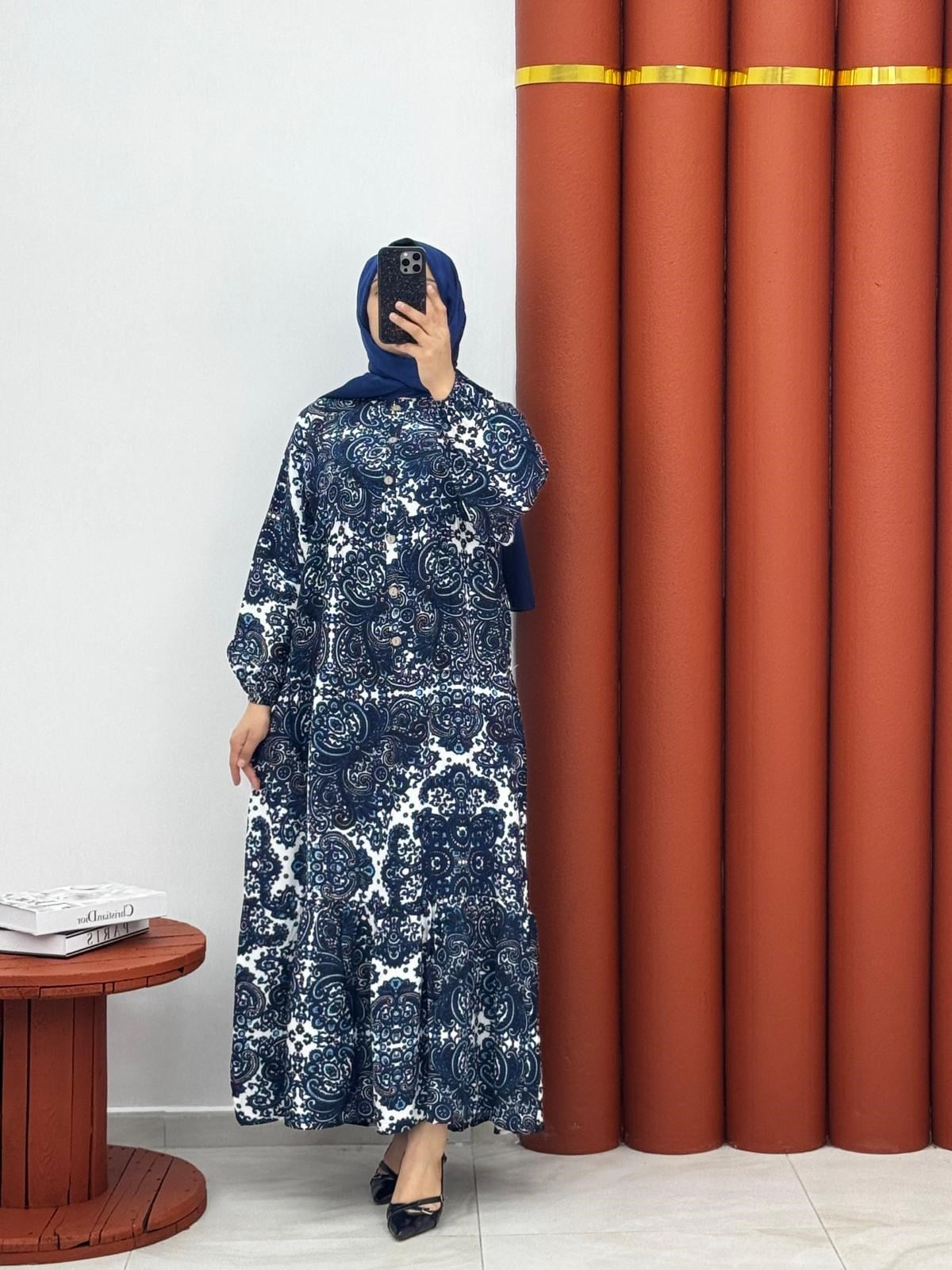 “Viskon kumaştan üretilen Alaçatı tarzı yarım düğmeli desenli elbise; hafif, nefes alan ve dökümlü yapısıyla yaz aylarında ferah bir kullanım sunar. Yumuşak dokusu ve akıcı duruşu sayesinde hem rahat hem de şık bir görünüm sağlar.”