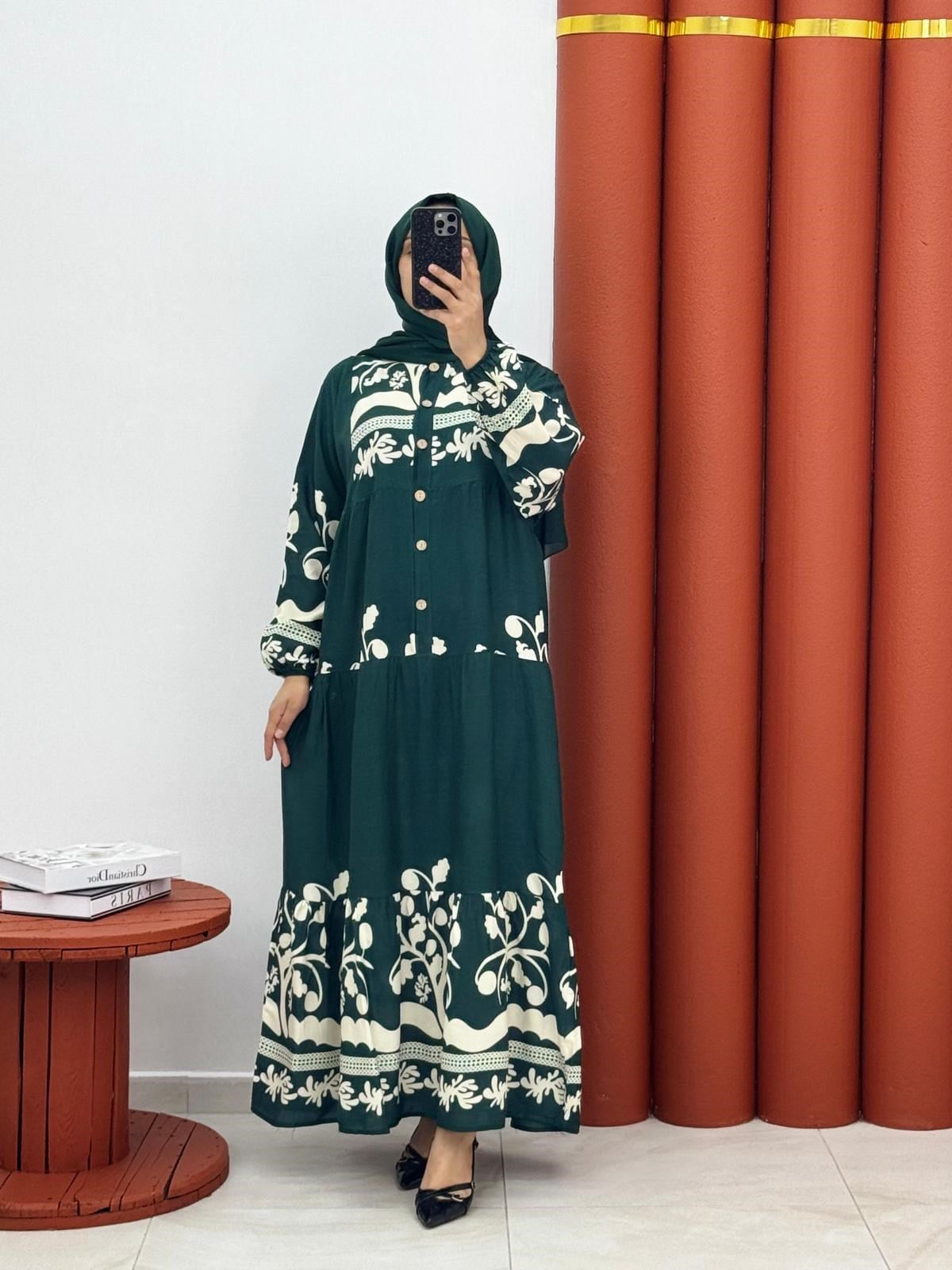 9397 Alaçatı yarım dügmeli elbise yeşil beyaz