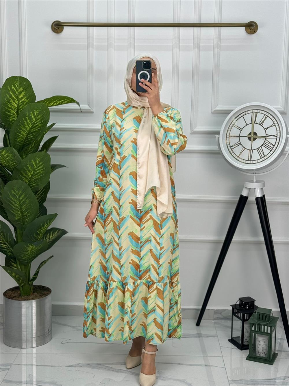 Viskon Kumaş Yeni Sezon Yeni Desen Seyyar Kemerli Elbise 0105 Kahverengi (A008-0105)