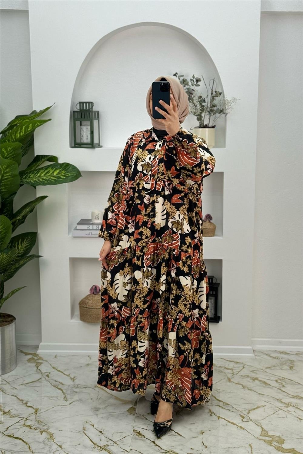 Viskon Kumaş Yeni Sezon Yeni Desen Yarım Düğmeli Belinay Elbise 0198 Kahverengi