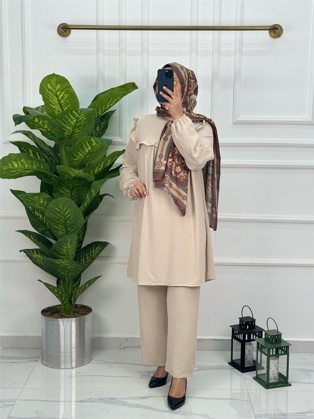 Yeni Sezon Airobin Kumaş Yarım Düğmeli Fırfır Detay Yaka İkili Takım 0150 Krem (ZHRA-0150)