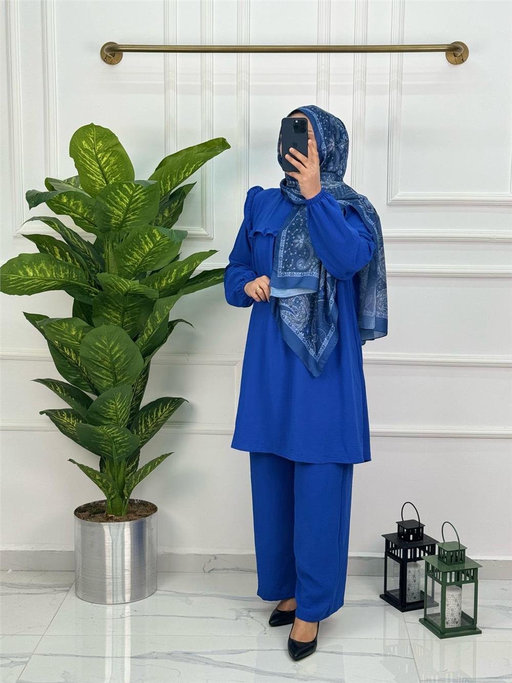 Yeni Sezon Airobin Kumaş Yarım Düğmeli Fırfır Detay Yaka İkili Takım 0150 Mavi (ZHRA-0150)