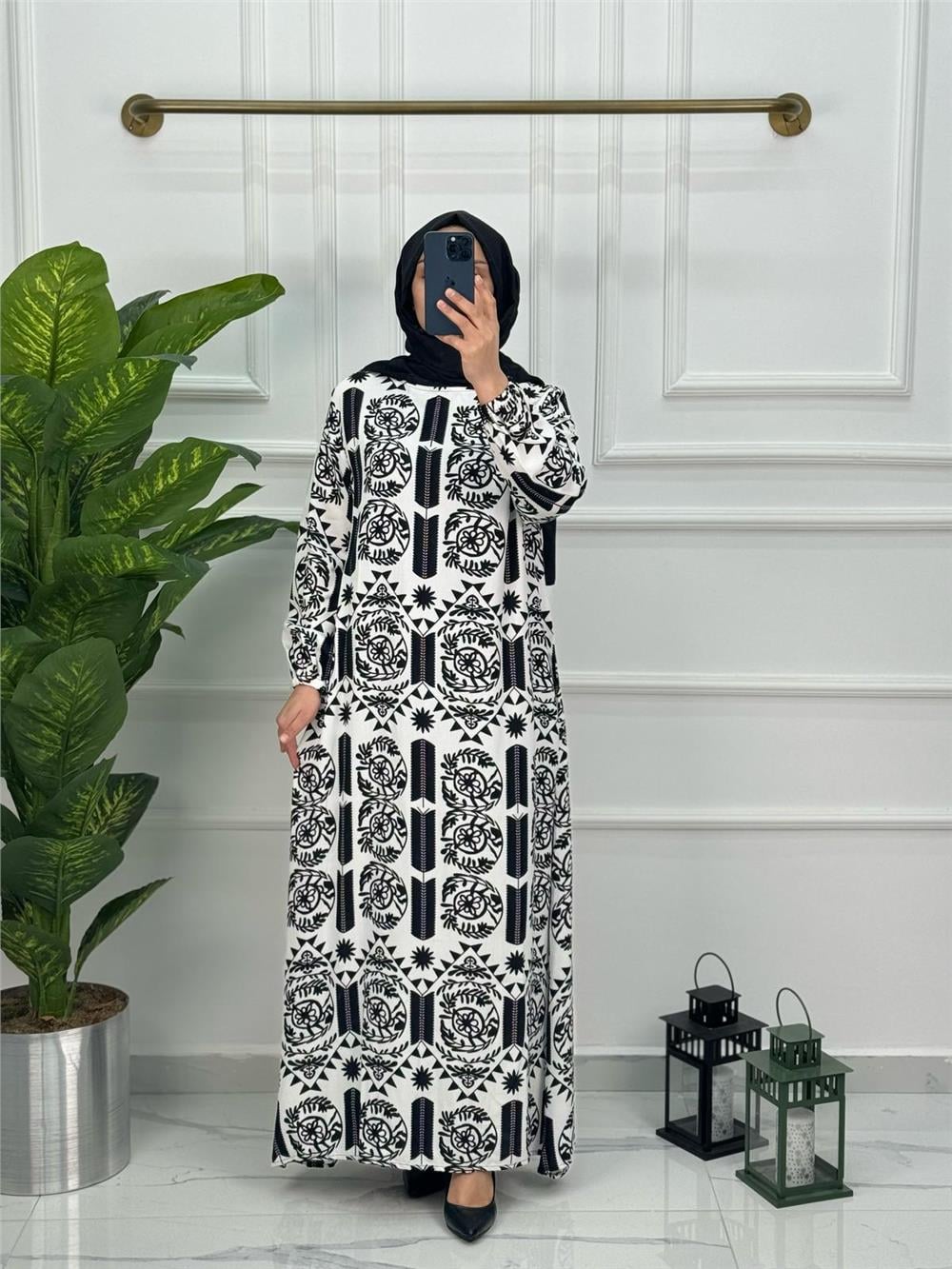 Yeni Sezon Viskon Etnik Desen Seyyar Kemerli Elbise 0146 Beyaz