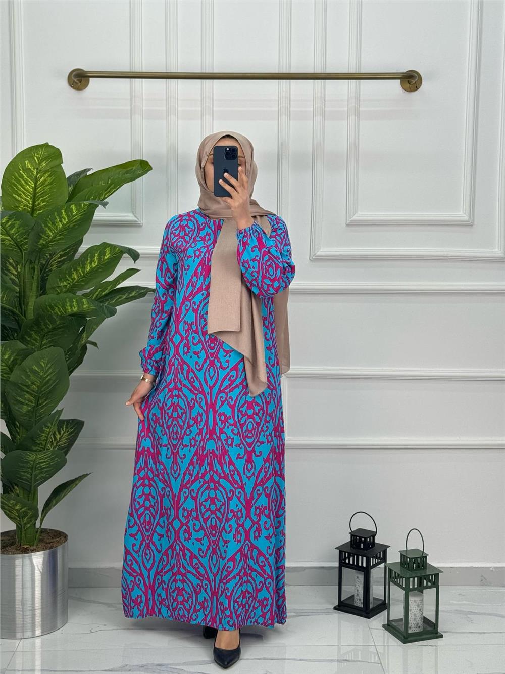 Yeni Sezon Yeni Desen Rahat Kalıp Viskon Seyyar Kemerli Elbise 0131 Mavi (B009-0131)